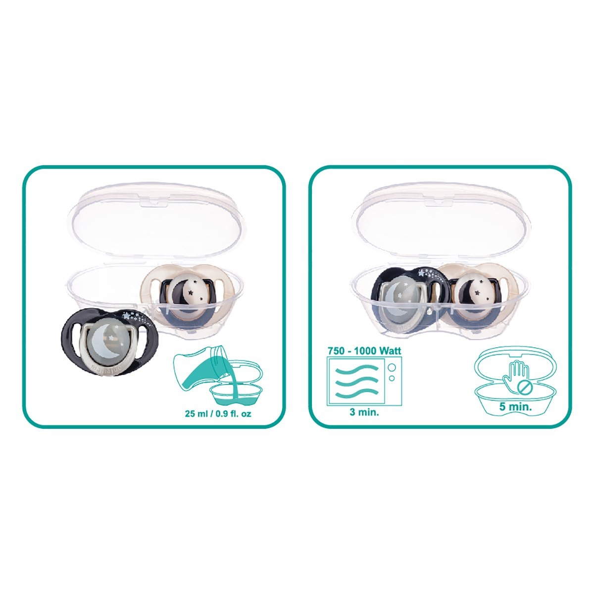 Mikrodalga kullanımı: Emzikler iyice yıkandıktan sonra Mamajoo Sterilizasyon & Saklama Kutusuna yerleştirilir ve içine 25 ml su eklenir. Mikrodalga 750-1000 W gücünde 3 dakika çalıştırılır. İşlem sonrası ürünler soğumaya bırakılır ve içindeki su döküldükten sonra hijyenik olarak kullanıma hazır hale gelir.